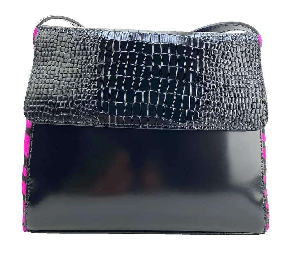 The Leo Monk "Nunzia" is a versatile cross body bag. Synonymous with the Leo Monk trademark of combining different coloured and textured leathers to create a truly individual accessory. Features an adjustable buckled strap as well as an internal zip pocket and mobile phone pouch. Patent leather trims.
